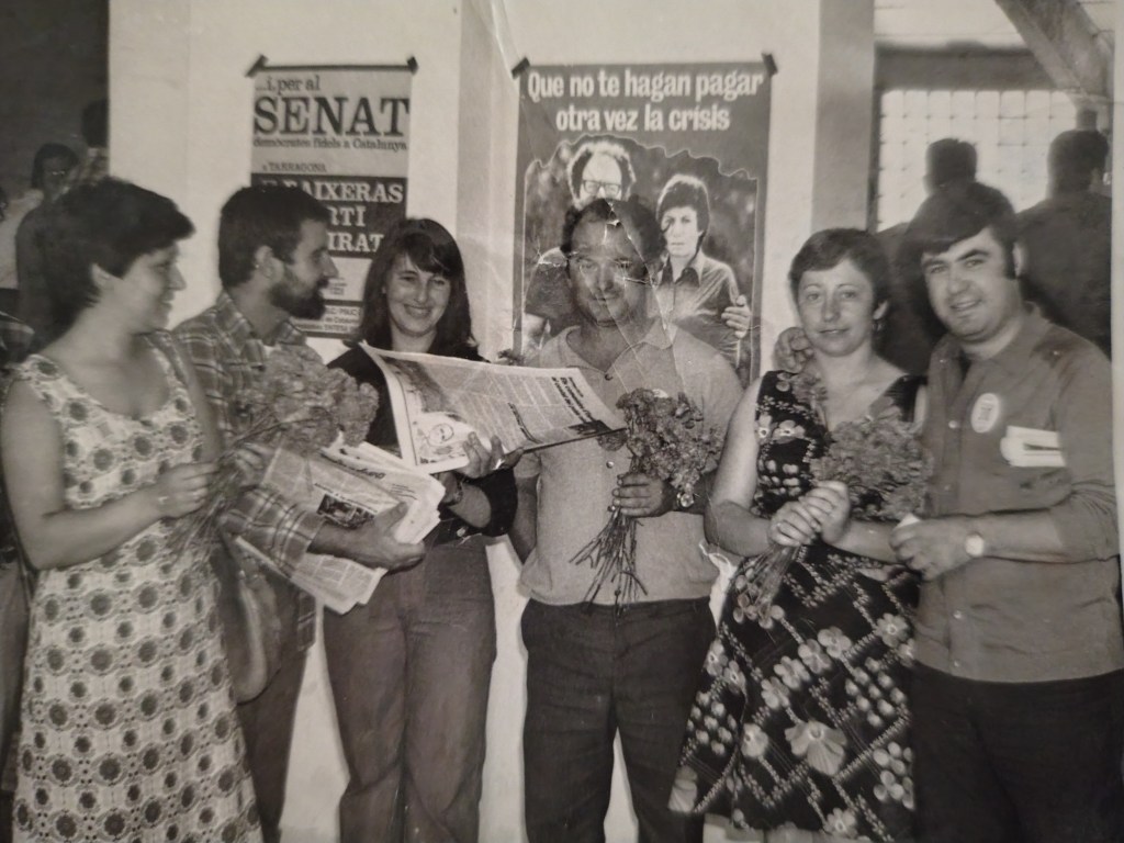 En tornar a Tortosa l’any 1977 passen dos fets significatius, que jo en sigui conscient, són els anys de major activitat política del meu pare, i comença a treballar d’electricista, tot i que sense tenir formació reglada. Són els anys de la transició i les primeres eleccions democràtiques passen aquell any. Pel llegat familiar, el meu pare s’apropa al PSUC, com es pot veure en la següent foto. El seu idili amb la política duraria poc, tot i que no me’n deixaria mai de parlar, remarcant que en va sortir molt decepcionat. Tot i així ell, a la seua manera, de la mateixa manera que va contribuir amb el seu granet al desenvolupament econòmic d’Espanya, també ho va fer per la democràcia i les igualtats socials.
